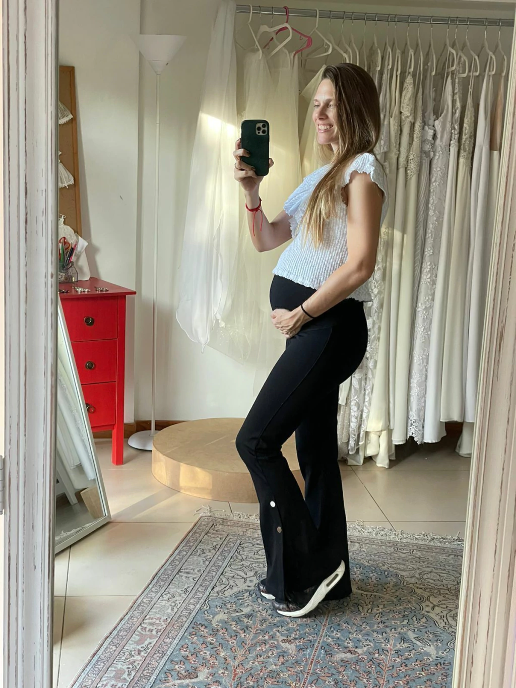 Todas nuestras calzas y pantalones tienen la cintura elástica tiro alto. La tela de la cintura sostiene pero no aprieta. Te va a acompañar todo el embarazo y después en el postparto cuando baja la panza también.